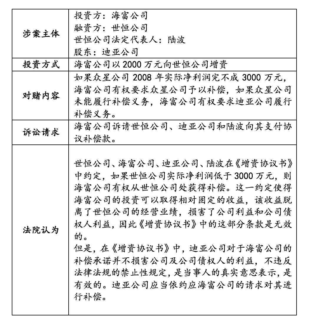 下面本所律師以2012年公報案例蘇州工業(yè)園區(qū)海富投資有限公司(以下簡稱“海富公司”)與甘肅世恒有色資源再利用有限公司(以下簡稱“世恒公司”)、香港迪亞有限公司(以下簡稱“迪亞公司”)、陸波增資糾紛案分析對賭協(xié)議的效力。