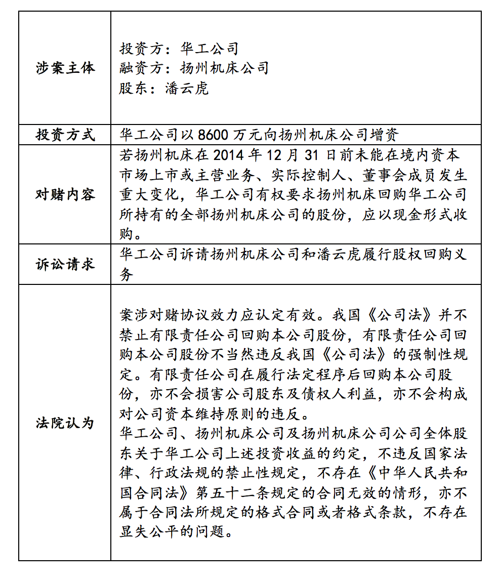 該案件判決后,后續(xù)法院對于“對賭協(xié)議”效力的判定皆以該案件作為指引,在實踐中總結(jié)出“與目標(biāo)公司對賭無效,與公司股東對賭有效”的裁判規(guī)則。