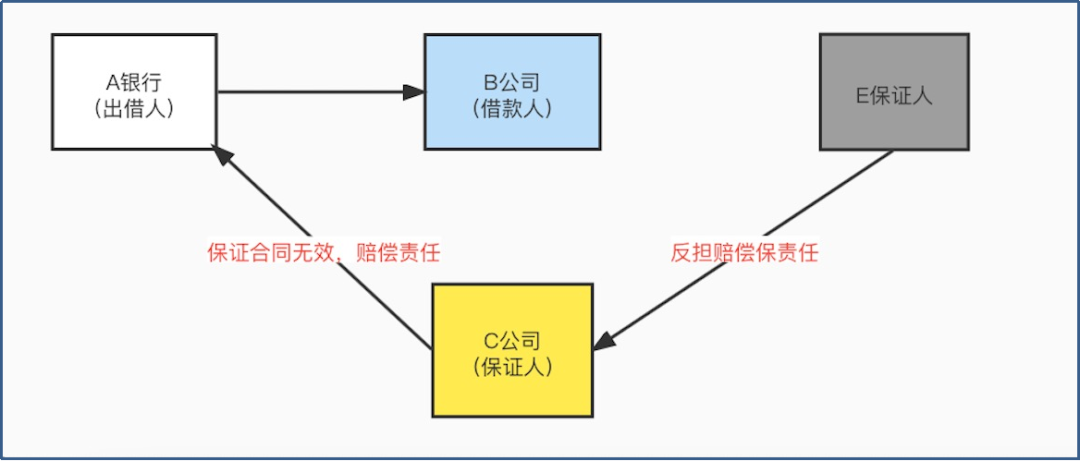 根據(jù)《擔(dān)保制度解釋》第十九條“擔(dān)保合同無效,承擔(dān)了賠償責(zé)任的擔(dān)保人按照反擔(dān)保合同的約定,在其承擔(dān)賠償責(zé)任的范圍內(nèi)請求反擔(dān)保人承擔(dān)擔(dān)保責(zé)任的,人民法院應(yīng)予支持。”之規(guī)定,如A銀行與C公司簽訂的《保證合同》因無股東會決議被宣布無效,C公司人對于合同無效存在過錯(cuò)且承擔(dān)了B公司不能清償債務(wù)的二分之一的賠償責(zé)任,則其可在承擔(dān)賠償責(zé)任的范圍內(nèi)依據(jù)雙方簽訂的《委托保證合同》向E保證人進(jìn)行追償(詳見圖二)。