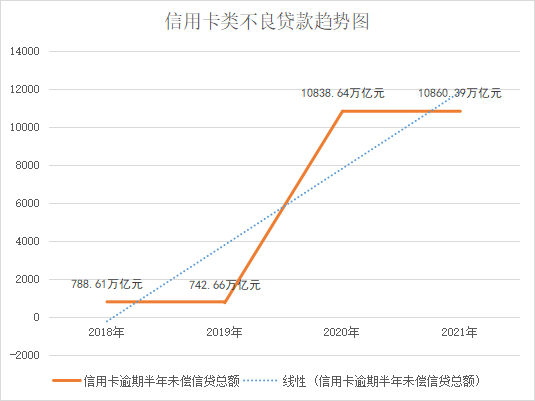 2022年4月2日,中國(guó)人民銀行發(fā)布《2021年支付體系運(yùn)行總體情況》,截至2021年末,全國(guó)共開立信用卡和借貸合一卡8.00億張,同比增長(zhǎng)2.85%,人均持有信用卡和借貸合一卡0.57張。截至2021年末,銀行卡授信總額為21.02萬(wàn)億元,同比增長(zhǎng)10.86%;銀行卡應(yīng)償信貸余額為8.62萬(wàn)億元,同比增長(zhǎng)8.90%。信用卡逾期半年未償信貸總額10860.39億元,占信用卡應(yīng)償信貸余額的1.00%。相比之下,2020年末的信用卡逾期半年未償信貸總額為10838.64億元,2019年為742.66億元,2018年為788.61億元,信用卡類個(gè)人不良貸款呈穩(wěn)步增長(zhǎng)的態(tài)勢(shì)。