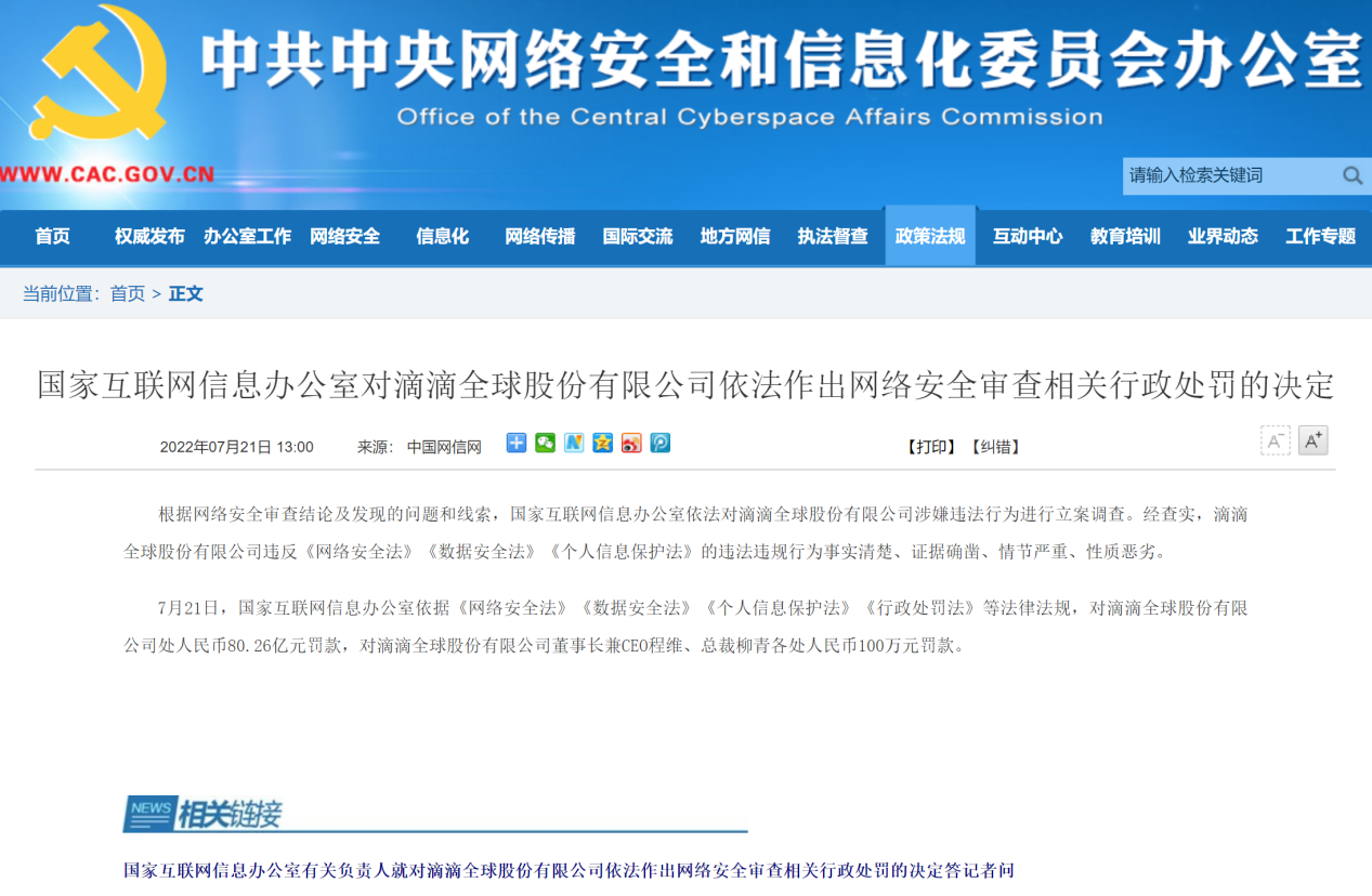 2022年7月21日,國(guó)家互聯(lián)網(wǎng)信息辦公室依據(jù)《網(wǎng)絡(luò)安全法》《數(shù)據(jù)安全法》《個(gè)人信息保護(hù)法》等法律法規(guī),對(duì)滴滴全球股份有限公司處人民幣80.26億元罰款,對(duì)滴滴全球股份有限公司董事長(zhǎng)兼CEO程維、總裁柳青各處人民幣100萬(wàn)元罰款。