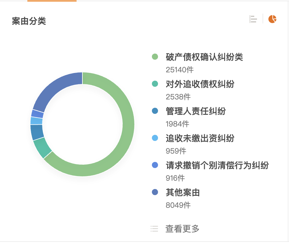 以“與破產(chǎn)有關(guān)的糾紛”作為案例檢索的關(guān)鍵詞,檢索范圍鎖定為2020年1月1日至2022年8月3日,在alpha數(shù)據(jù)庫檢索到民事案件總額39,500件,其中破產(chǎn)債權(quán)確認(rèn)糾紛25,140件、對外追收債權(quán)糾紛2,538件、管理人責(zé)任糾紛1,984件、追收未繳出資糾紛959件、請求撤銷個別清償行為糾紛916件,物權(quán)糾紛、侵權(quán)責(zé)任糾紛等其他案由糾紛8,049件。如下圖所示: