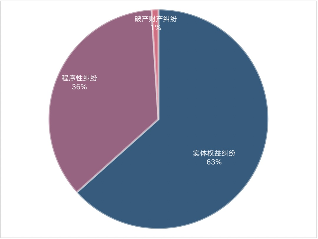 我們針對2020年以來的破產(chǎn)債權(quán)確認(rèn)糾紛類17,900件案例進行系統(tǒng)分析,主要劃分為三類,即實體權(quán)益類糾紛11,368件,占比63%;與破產(chǎn)程序相關(guān)的糾紛6,378件,占比36%;與債務(wù)人財產(chǎn)有關(guān)糾紛包括別除權(quán)、撤銷權(quán)和取回權(quán)等糾紛154件,占比1%。