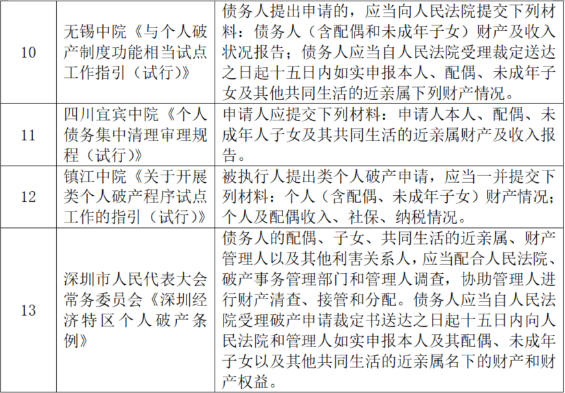 綜上可以看出,上述個(gè)人債務(wù)集中清理相關(guān)制度及深圳經(jīng)濟(jì)特區(qū)的個(gè)人破產(chǎn)條例中,均在債務(wù)人申請(qǐng)個(gè)人破產(chǎn)的同時(shí),要求債務(wù)人提交配偶、共同生活的近親屬、利害關(guān)系人等如實(shí)報(bào)告財(cái)務(wù)情況,并要求明確說(shuō)明財(cái)產(chǎn)來(lái)源。這不僅是為了保障債權(quán)人的合法權(quán)益不受侵害,同時(shí)也是對(duì)債務(wù)人撫養(yǎng)的家庭成員保留必要財(cái)產(chǎn)提供相應(yīng)依據(jù),更人性化的試行債務(wù)清理制度和個(gè)人破產(chǎn)制度。