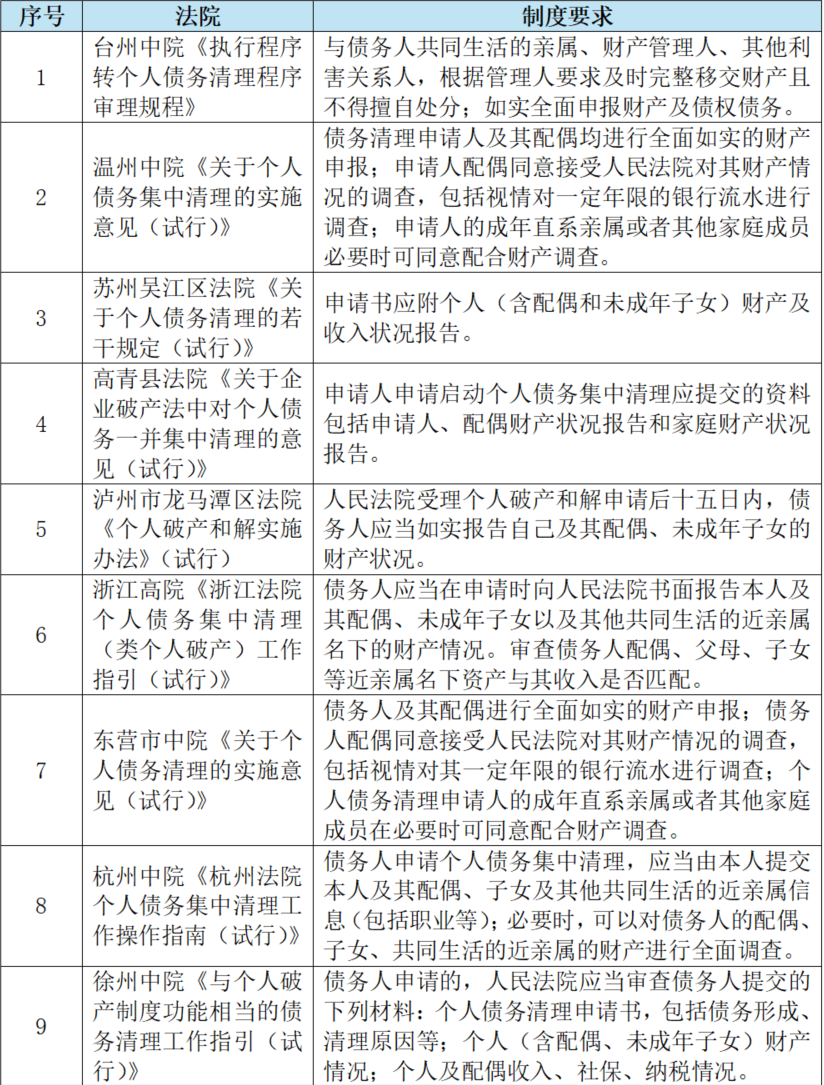 2019年,最高人民法院《關(guān)于深化執(zhí)行改革健全解決執(zhí)行難長(zhǎng)效機(jī)制的意見(jiàn)-人民法院執(zhí)行工作綱要(2019-2023)》中提出開(kāi)展與個(gè)人破產(chǎn)制度功能相當(dāng)?shù)脑圏c(diǎn)工作,為建立個(gè)人破產(chǎn)制度打下實(shí)踐基礎(chǔ)?;诖?,各地陸續(xù)出臺(tái)類(lèi)個(gè)人破產(chǎn)制度的個(gè)人債務(wù)清理制度。在各地個(gè)人債務(wù)清理制度中,為全面核查個(gè)人的資產(chǎn)情況,均對(duì)夫妻一方破產(chǎn)時(shí),另一方的配合義務(wù)作了規(guī)定。筆者對(duì)比了公開(kāi)渠道查詢(xún)的各地個(gè)人債務(wù)清理制度中的該部分內(nèi)容,具體如下: