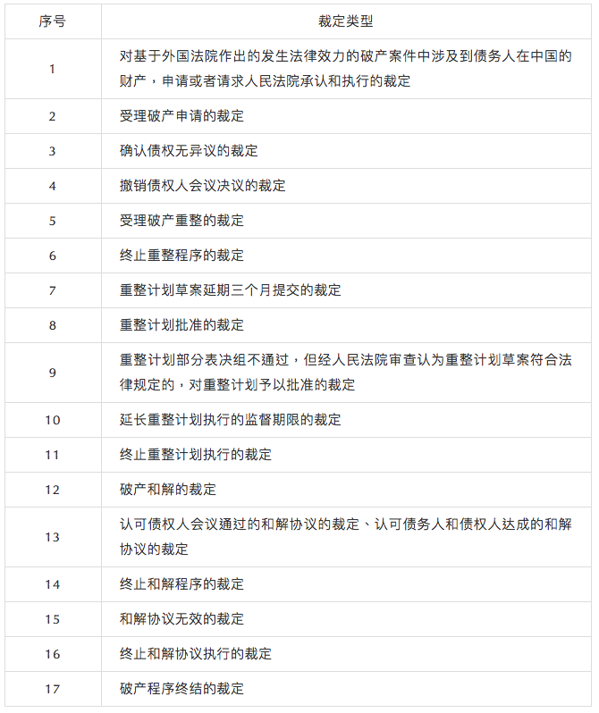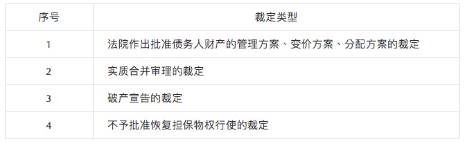 依據(jù)《企業(yè)破產(chǎn)法》第4條規(guī)定:“破產(chǎn)案件審理程序,本法沒有規(guī)定的,適用民事訴訟法的有關(guān)規(guī)定。”《民事訴訟法》第154條之規(guī)定,不予受理、對(duì)管轄權(quán)有異議的、駁回起訴的裁定可以上訴?!蹲罡呷嗣穹ㄔ宏P(guān)于適用<中華人民共和國民事訴訟法>的解釋》第380條規(guī)定:“適用特別程序、督促程序、公示催告程序、破產(chǎn)程序等非訴程序?qū)徖淼陌讣?,?dāng)事人不得申請(qǐng)?jiān)賹彙?rdquo;破產(chǎn)程序?qū)儆谑翘貏e程序,而上表所列裁定在破產(chǎn)程序中無特別規(guī)定,故不具有可訴性。不可訴的裁定中頗具爭議的有: