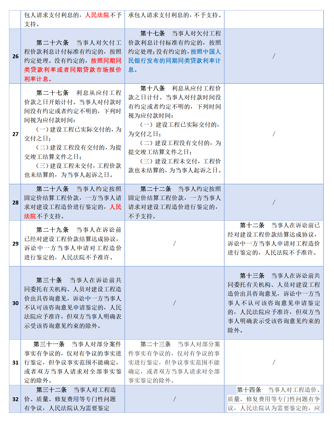 原解釋(一)規(guī)定,當(dāng)事人對(duì)欠付工程價(jià)款利息計(jì)付標(biāo)準(zhǔn)沒(méi)有約定時(shí),按照中國(guó)人民銀行發(fā)布的同期同類貸款利率計(jì)付。新解釋(一)第二十六條規(guī)定,按照同期同類貸款利率或者同期貸款市場(chǎng)報(bào)價(jià)利率計(jì)息。