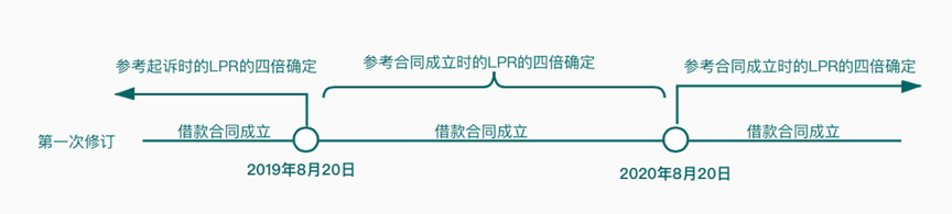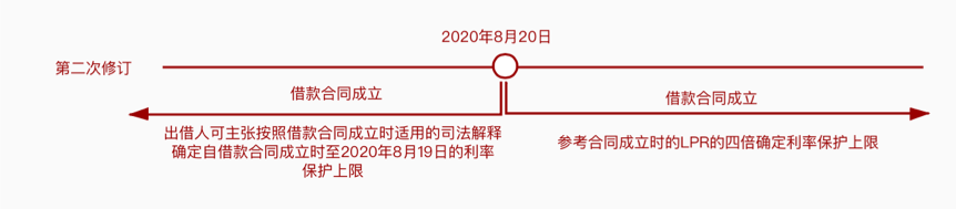 如上圖所示,《民間借貸司法解釋第二次修訂》改變了《民間借貸司法解釋第一次修訂》中所確定的“一刀切”地適用一年期的貸款市場報價利率的四倍的標準?!睹耖g借貸司法解釋第二次修訂》以2020年8月20日為分界點,對于借款合同成立于2020年8月20日前的民間借貸糾紛案件,出借人可以主張按照合同成立時所適用的司法解釋所確定的利率保護上限計算自借款合同成立后至2020年8月19日期間的利息,對于借款合同成立于2020年8月20日后的民間借貸糾紛案件,繼續(xù)適用一年期的貸款市場報價利率的四倍。