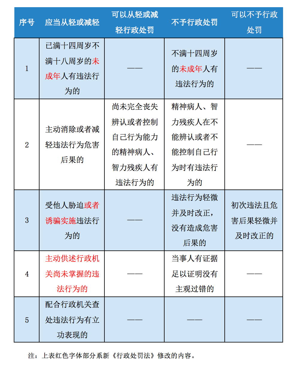 首違不罰即首次違法且危害后果輕微并及時改正的,可以不予行政處罰。其最早是國家稅務(wù)部門為規(guī)范行政處罰自由裁量權(quán)引入的制度。此次,新《行政處罰法》以法律的形式將其納入行政處罰法律體系,對行政機關(guān)依法執(zhí)法、保障當(dāng)事人合法權(quán)益具有重大意義。首違不罰明確納入新《行政處罰法》后,其中關(guān)于從輕或減輕行政處罰、不予行政處罰的具體情形與以往相比有了較大變化,具體內(nèi)容如下: