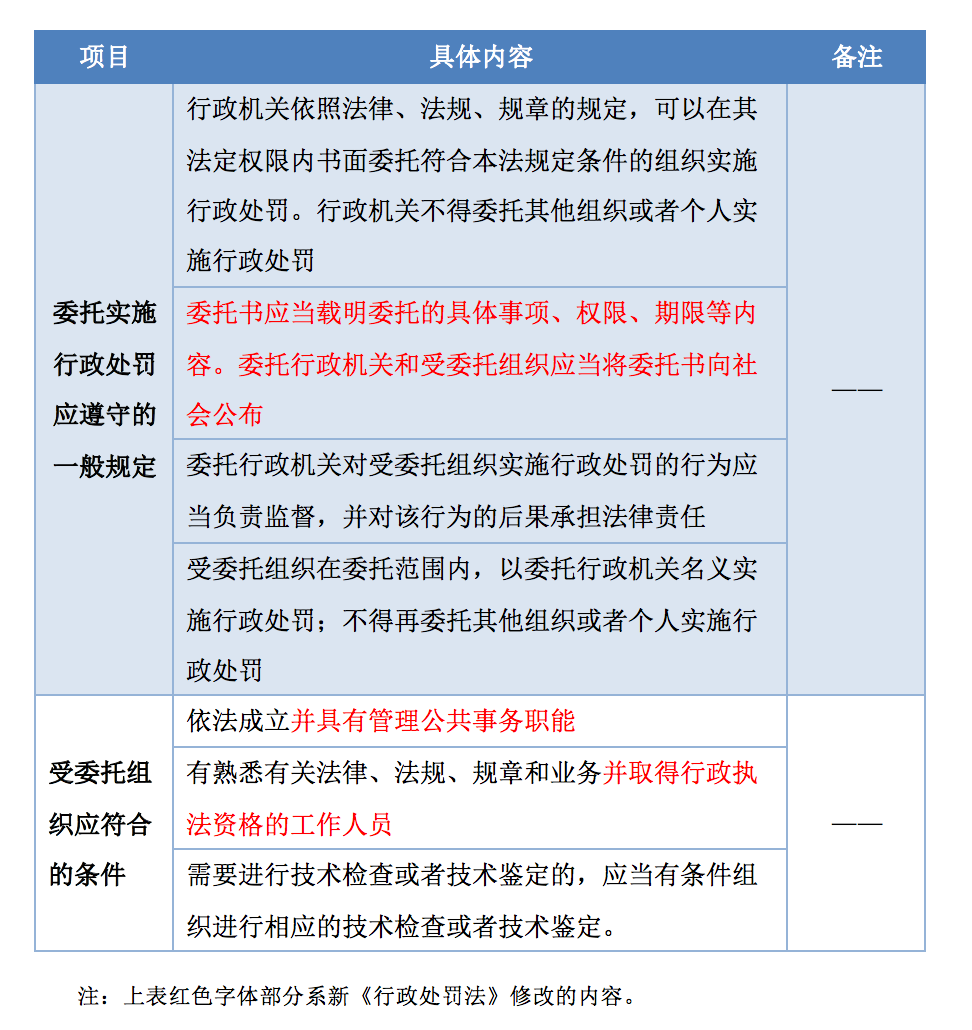 新《行政處罰法》在保留舊《行政處罰法》關(guān)于委托符合條件的組織實施行政處罰及受委托組織不得再委托其他組織或個人實施行政處罰的基礎(chǔ)上增加了關(guān)于公開委托書的內(nèi)容,并對受委托組織應(yīng)符合的條件作了修改。根據(jù)新《行政處罰法》第二十條、第二十一條的規(guī)定,新《行政處罰法》關(guān)于委托實施行政處罰的具體規(guī)定如下:
