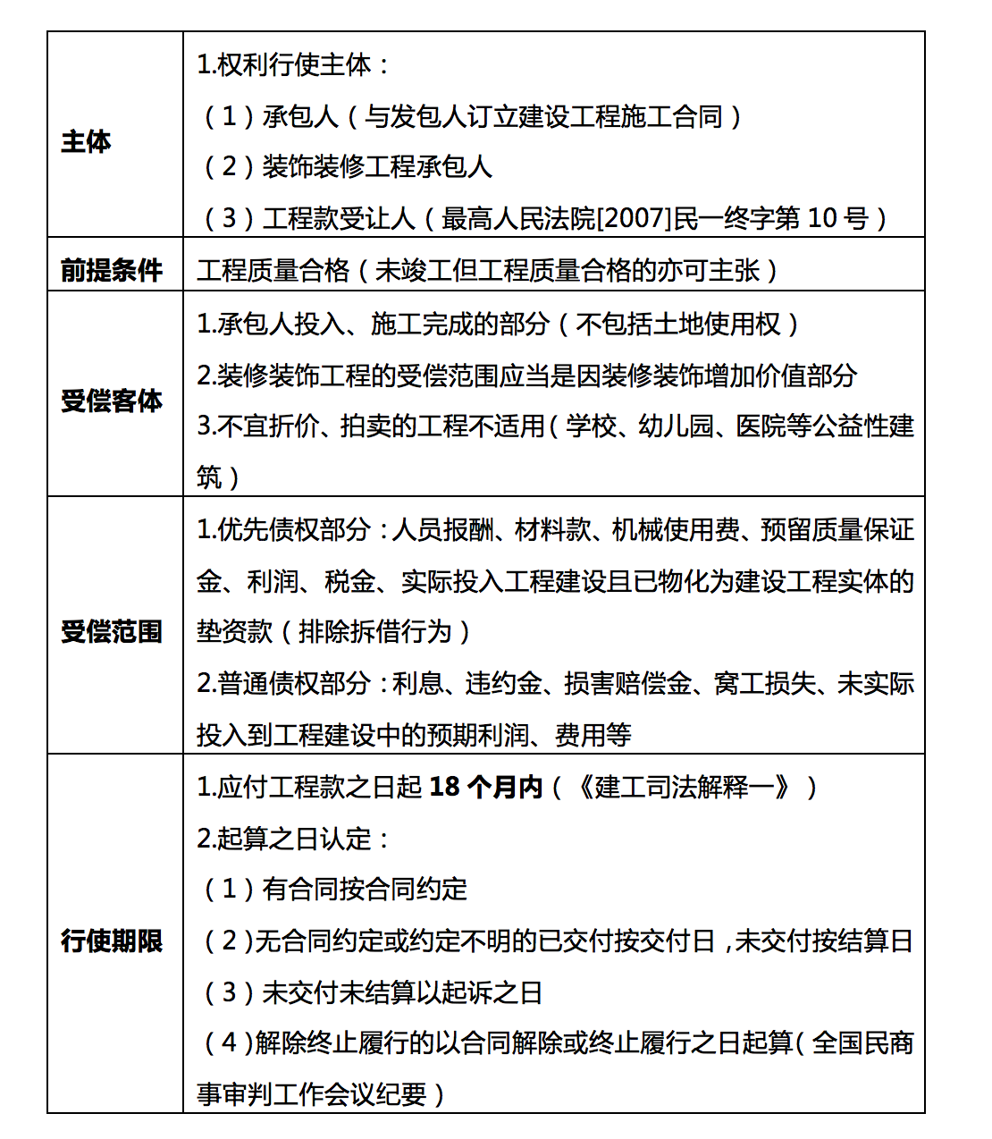 2021年1月1日《民法典》施行,其中第八百零六條保留了《合同法》關(guān)于建設(shè)工程價(jià)款優(yōu)先受償權(quán)的規(guī)定,同日《建工司法解釋(一)》修訂生效,對(duì)建設(shè)工程價(jià)款優(yōu)先受償權(quán)的修訂主要有三大變化:1.明確提出建設(shè)工程價(jià)款優(yōu)先受償權(quán)優(yōu)先于抵押權(quán)和其他債權(quán)。2.建設(shè)工程優(yōu)先受償權(quán)行使期限從6個(gè)月放寬到18個(gè)月;3.刪除了裝修裝飾工程的發(fā)包人是該建筑物所有權(quán)人的前提,修改為“裝修裝飾工程具備折價(jià)或者拍賣(mài)條件”。根據(jù)現(xiàn)行法律法規(guī)、司法解釋規(guī)定,對(duì)建設(shè)工程優(yōu)先受償權(quán)的認(rèn)定及范圍梳理如下: