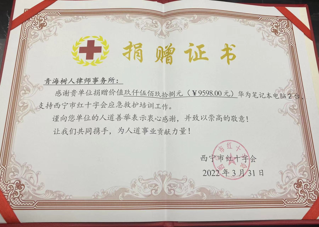3月31日上午,青海樹人律師事務(wù)所在黨支部號(hào)召下向西寧市紅十字會(huì)捐贈(zèng)華為筆記本電腦兩臺(tái),助力紅十字會(huì)應(yīng)急救護(hù)培訓(xùn)工作。捐贈(zèng)儀式在西寧市紅十字會(huì)二樓舉行,青海樹人律師事務(wù)所綜合服務(wù)中心主任黃秋君、西寧市紅十字會(huì)黨組書記葉智平出席儀式。