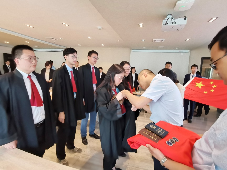 在國旗前,新執(zhí)業(yè)律師身著律師袍,在監(jiān)誓人的監(jiān)督與見證下進(jìn)行了莊嚴(yán)宣誓。