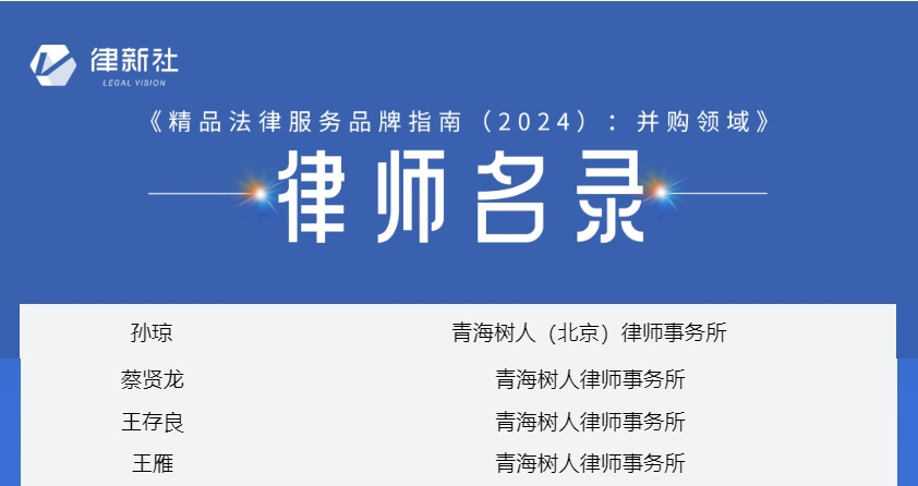 樹人榮譽(yù)| 樹人律所入選律新社《精品法律服務(wù)品牌指南(2024):并購領(lǐng)域》律所名錄,孫瓊律師榮獲匠心律師,4名律師榮膺律師名錄