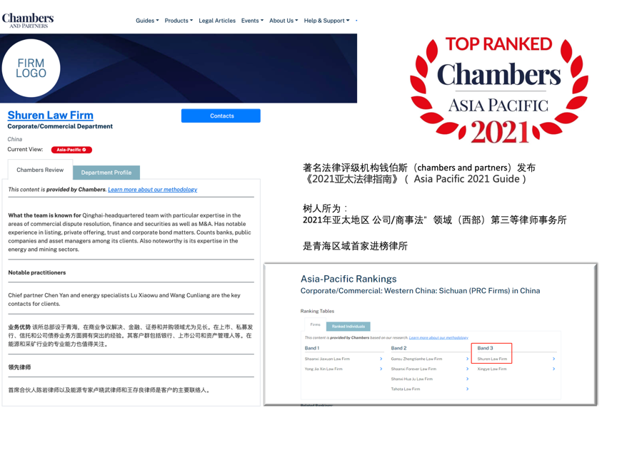 2021年1月13日,國際權(quán)威法律評級機(jī)構(gòu)錢伯斯(Chambers and Partners)發(fā)布的《錢伯斯亞太法律指南2021》(Chambers Asia-Pacific 2021)新近公布了公司/商事(Corporate/Commercial)領(lǐng)域的地區(qū)榜單,樹人律師事務(wù)所榮膺公司商事榜單,是青海省首家上榜律所。
