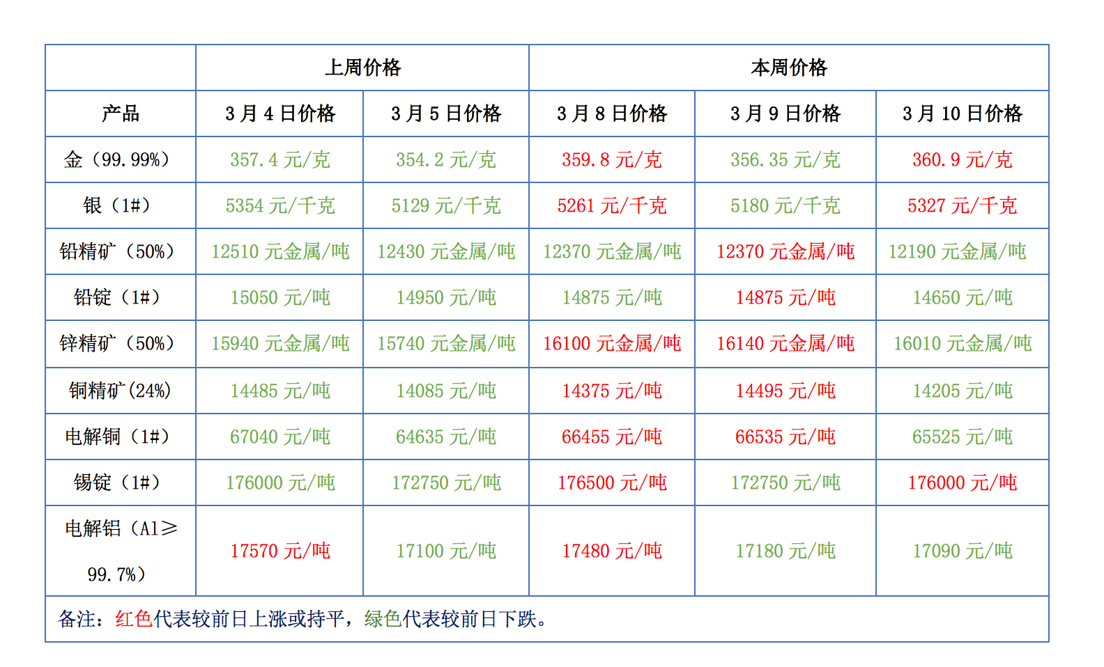 下表為本周金、銀、鉛、鋅、銅、鋁等主要有色金屬礦產(chǎn)品價格變動情況: