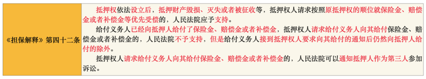 ③本條重點在于說明擔保物權(quán)的物上代位性,即抵押權(quán)人設(shè)立抵押權(quán)時并不以占有和使用抵押財產(chǎn)為目的,而是控制抵押財產(chǎn)的真實價值。因此,即使抵押財產(chǎn)本身已經(jīng)毀損、滅失,但只要該抵押財產(chǎn)的替代物還存在,則該抵押權(quán)的效力就會及于因毀損、滅失所得的賠償金等代位物上。