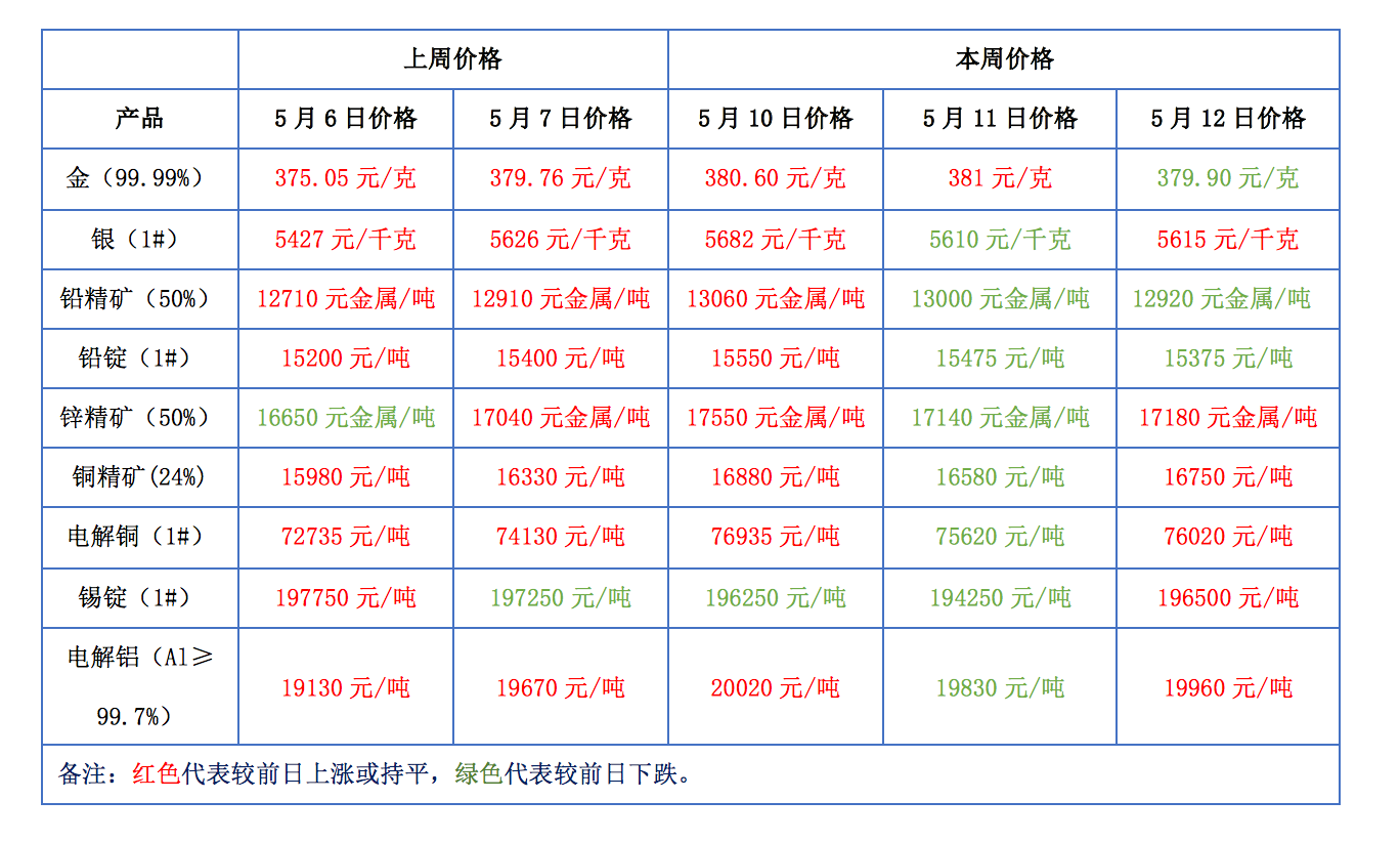 下表為本周金、銀、鉛、鋅、銅、鋁等主要有色金屬礦產(chǎn)品價格變動情況: