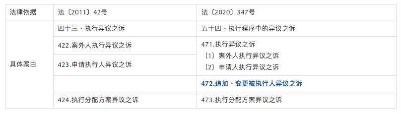 2020年12月29日,最高人民法院結(jié)合人民法院民事審判工作實際,印發(fā)《關(guān)于修改〈民事案件案由規(guī)定〉的決定》(法〔2020〕346號),對2011年2月18日第一次修正的《民事案件案由規(guī)定》進行修改,新增“追加、變更被執(zhí)行人異議之訴”為二級案由。當前執(zhí)行異議之訴的案由如下: