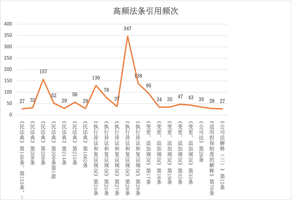 此處我們統(tǒng)計了執(zhí)行異議之訴案件中被援引的高頻法條,其中,高頻實體法條情況如下(鑒于本報告發(fā)布于民法典實施之后,本所律師已對相關(guān)法條進行了同步更新):