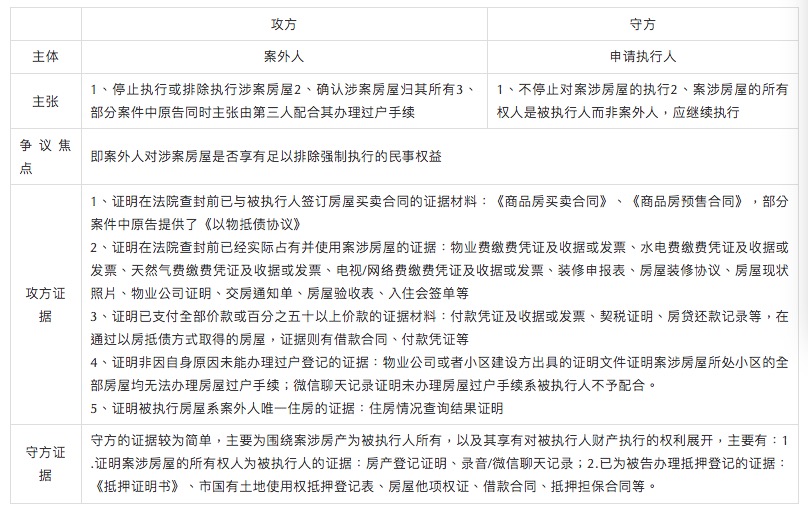 根據(jù)起訴主體的不同,案外人與申請(qǐng)執(zhí)行人的訴辯主張、證據(jù)情況等均有所不同,但無論是哪一方提起訴訟,參與對(duì)抗的兩方主體基本固定,即:主張停止執(zhí)行或排除執(zhí)行涉案房屋的,在此類案件中可作為攻方當(dāng)事人;而主張不應(yīng)停止或繼續(xù)對(duì)涉案房屋執(zhí)行的,在此類案件中可作為守方當(dāng)事人。具體如下: