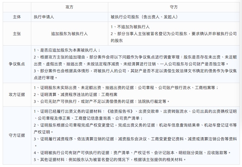 本案根據(jù)起訴主體的不同,其訴辯主張、證據(jù)組織等均有不同,但是無論哪一方提起訴訟,參與對(duì)抗的兩方主體基本固定,即,執(zhí)行案件中的申請(qǐng)執(zhí)行人,主張追加被執(zhí)行公司的股東為被執(zhí)行人,要求其在一定范圍內(nèi)對(duì)公司債務(wù)承擔(dān)清償責(zé)任,可以稱之為攻方;而作為被執(zhí)行公司的股東,主張不應(yīng)追加其為被執(zhí)行人,不對(duì)公司債務(wù)承擔(dān)清償責(zé)任,處于守方地位。具體如下: