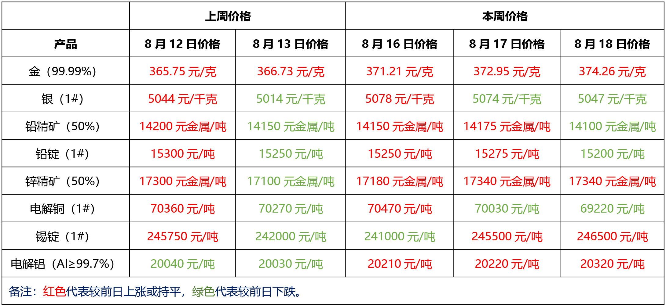 金、銀、鉛、鋅、銅、鋁等主要金屬本周報(bào)價(jià)