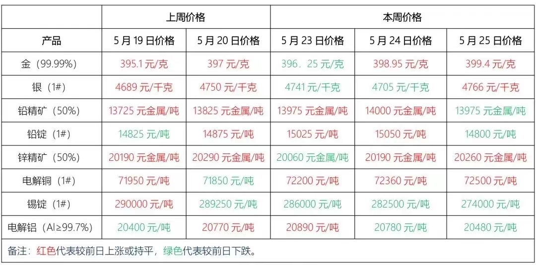 金、銀、鉛、鋅、銅、鋁等主要金屬本周報價