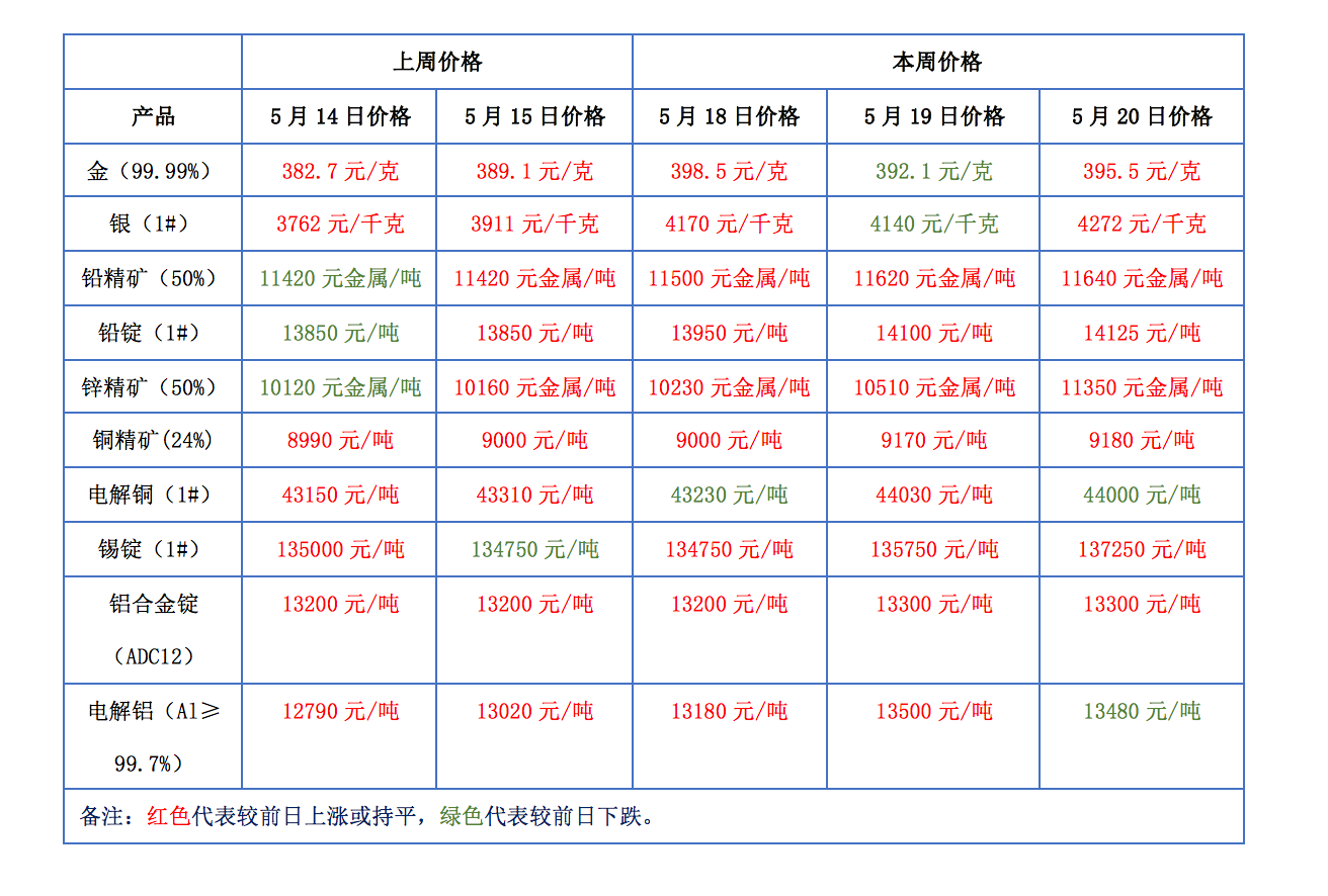下表為本周金、銀、鉛、鋅、銅、鋁等主要有色金屬礦產品價格變動情況: