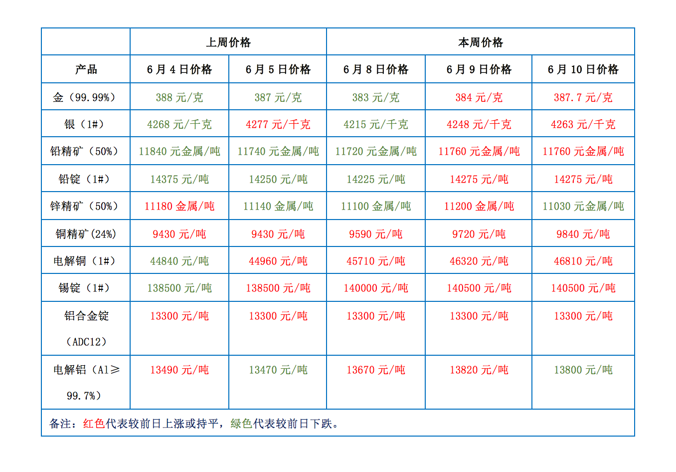 下表為本周金、銀、鉛、鋅、銅、鋁等主要有色金屬礦產(chǎn)品價(jià)格變動(dòng)情況:
