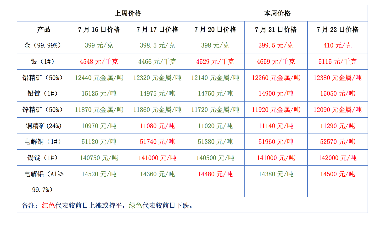 下表為本周金、銀、鉛、鋅、銅、鋁等主要有色金屬礦產(chǎn)品價(jià)格變動(dòng)情況: