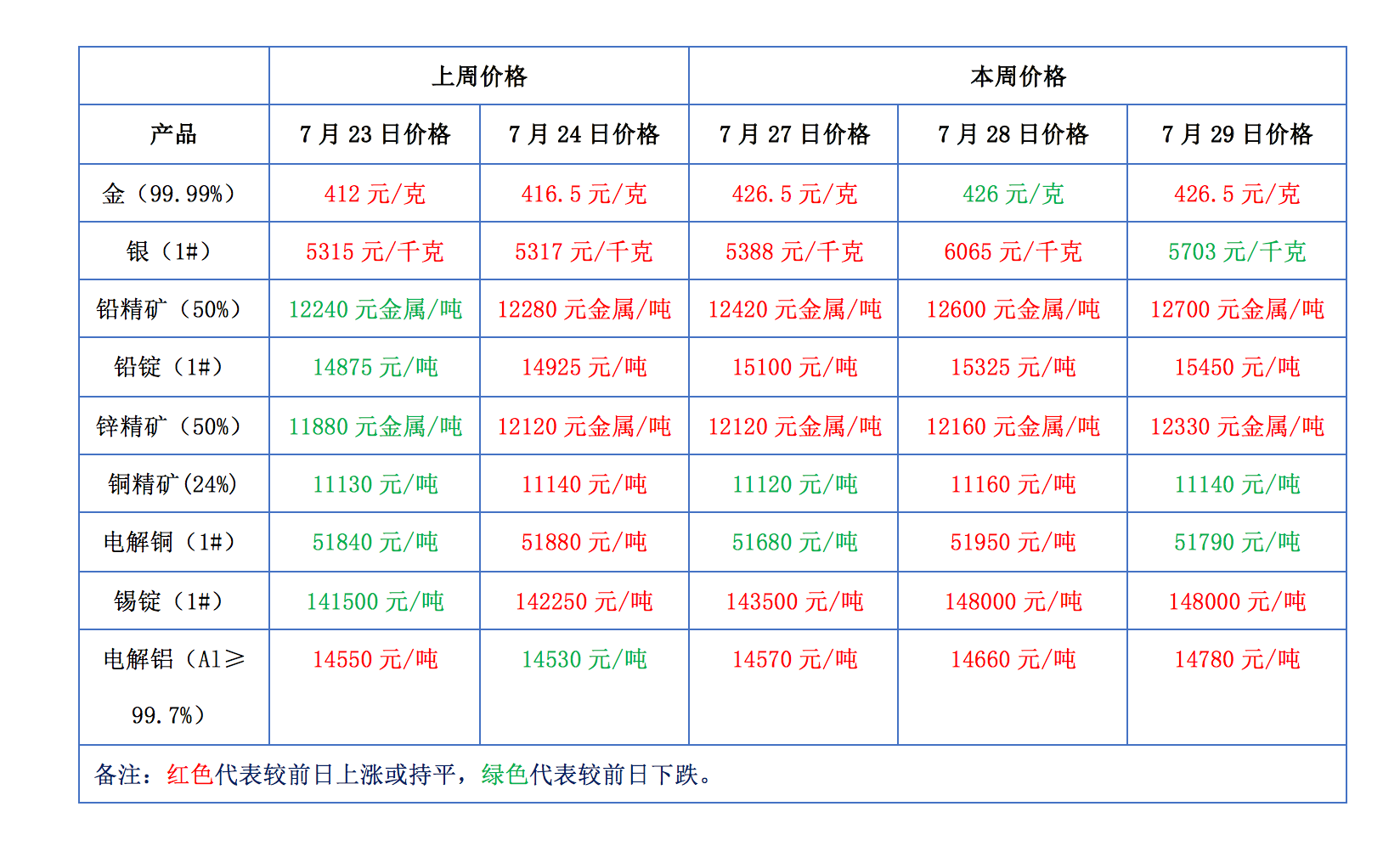 下表為本周金、銀、鉛、鋅、銅、鋁等主要有色金屬礦產(chǎn)品價(jià)格變動(dòng)情況: