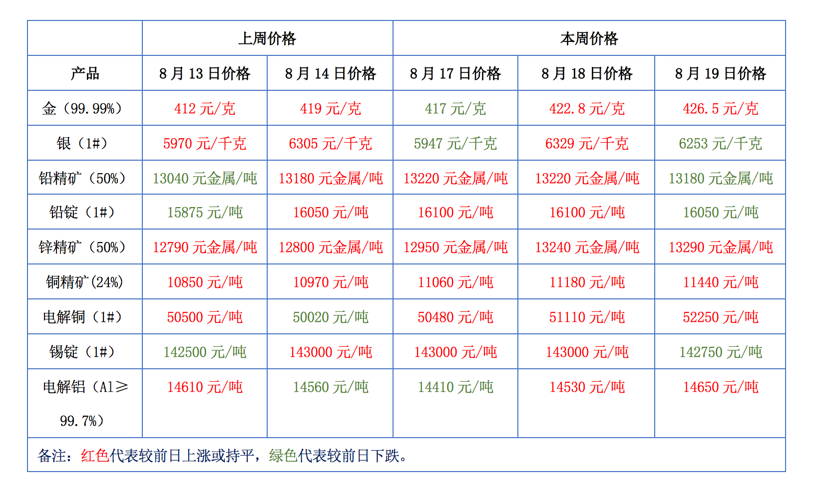 金、銀、鉛、鋅、銅、鋁等主要金屬本周報價