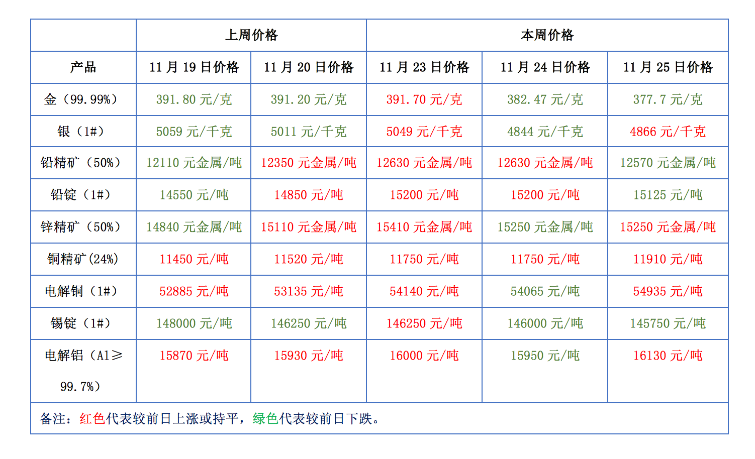 下表為本周金、銀、鉛、鋅、銅、鋁等主要有色金屬礦產(chǎn)品價格變動情況: