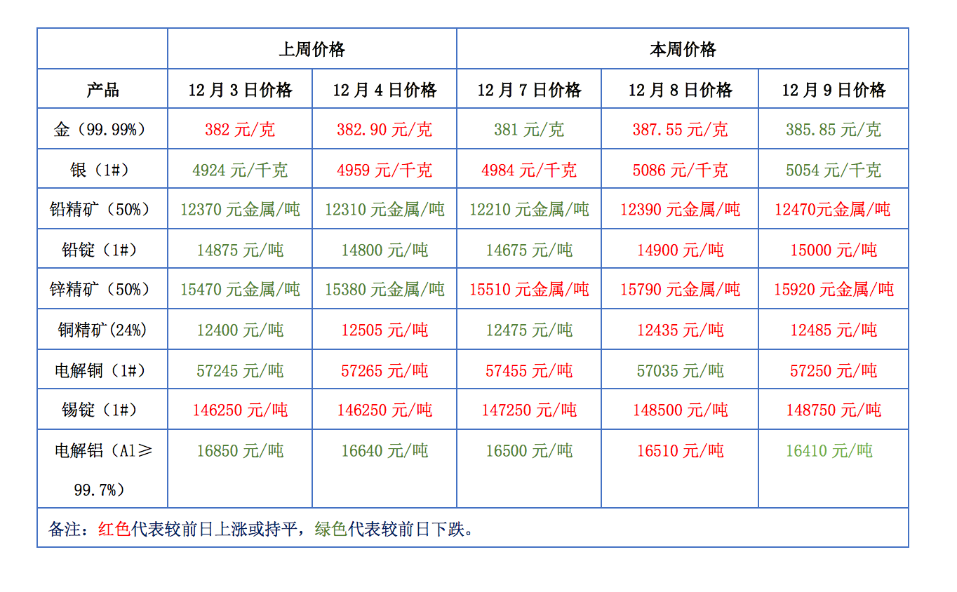 下表為本周金、銀、鉛、鋅、銅、鋁等主要有色金屬礦產(chǎn)品價格變動情況: