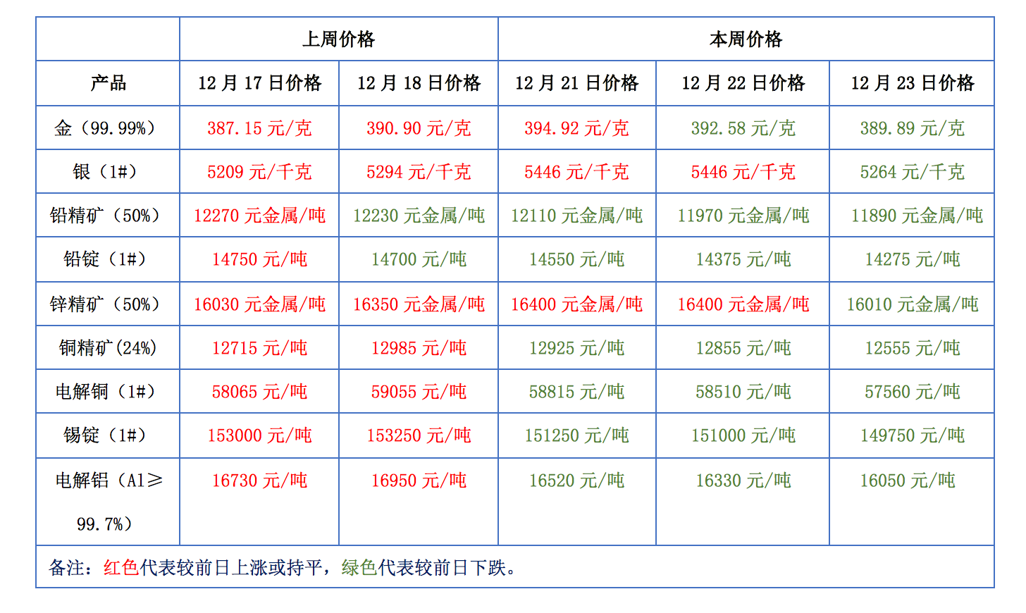 下表為本周金、銀、鉛、鋅、銅、鋁等主要有色金屬礦產(chǎn)品價(jià)格變動(dòng)情況: