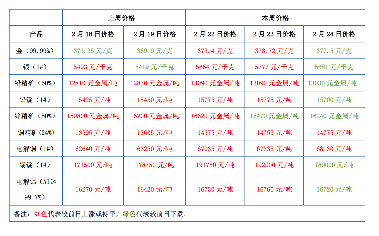 下表為本周金、銀、鉛、鋅、銅、鋁等主要有色金屬礦產(chǎn)品價格變動情況: